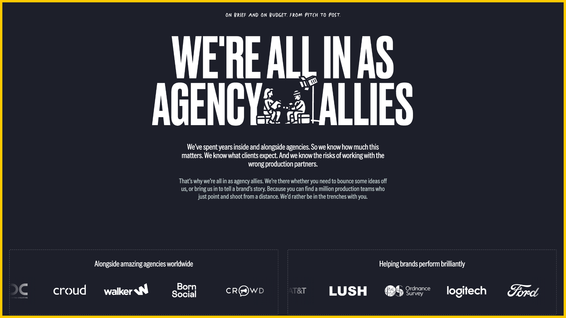 We repositioned ThinReel from a generalist video agency to specialists in partnering with other creative and advertising agencies. By focusing on supporting agencies through PitchIn™ as well as production, they’ve built a more defined niche, stronger relationships and a trusted reputation as the behind-the-scenes partner that helps agencies win and deliver great work.